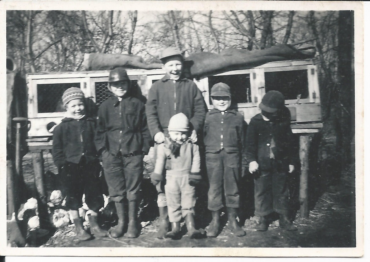 Sven-Erik, lille Preben og 2 af Bimmers legekammerater foran nogle af kaninburene.